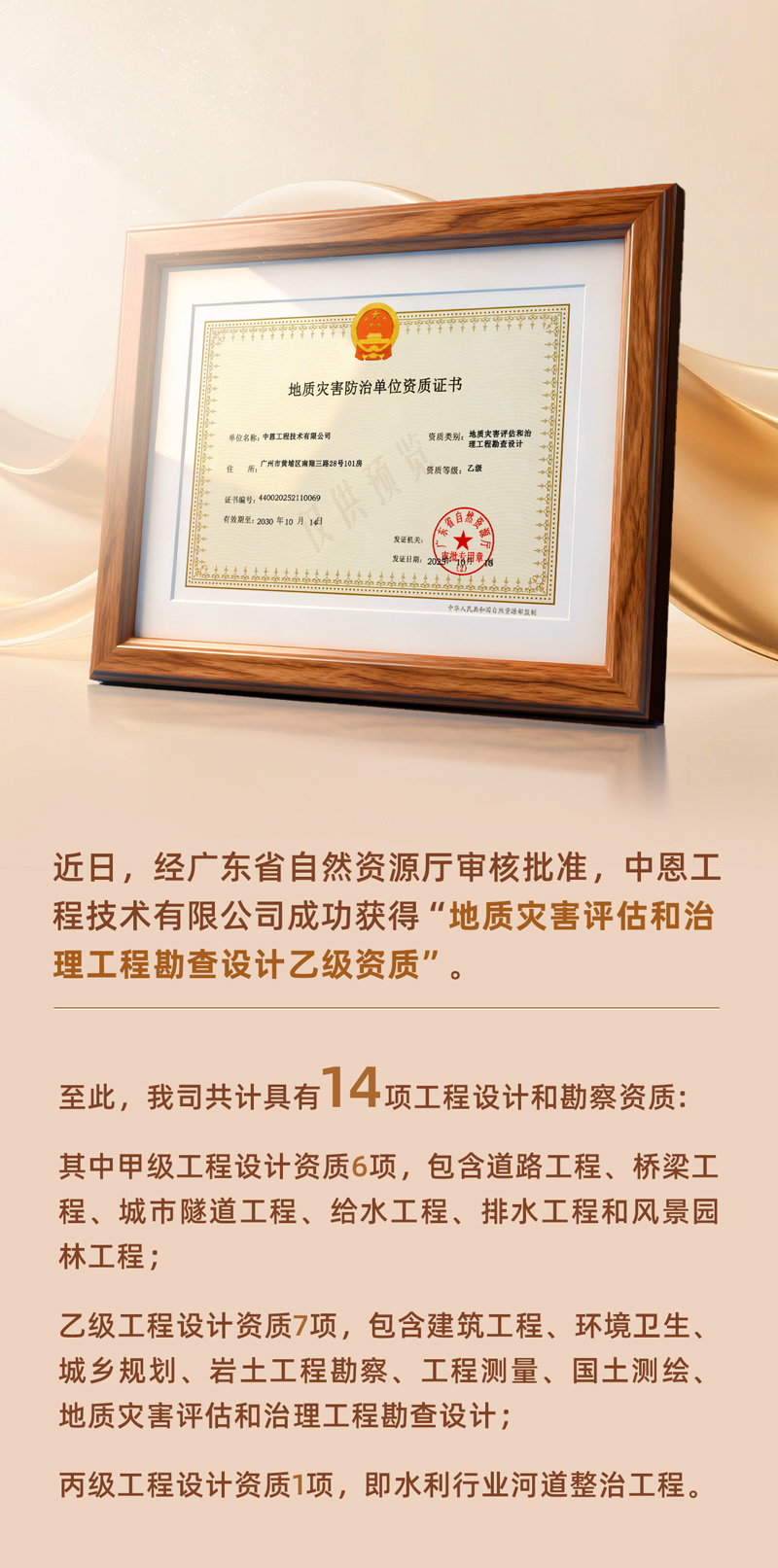 喜讯|中恩公司成功获批地质灾害评估和治理工程勘查设计资质